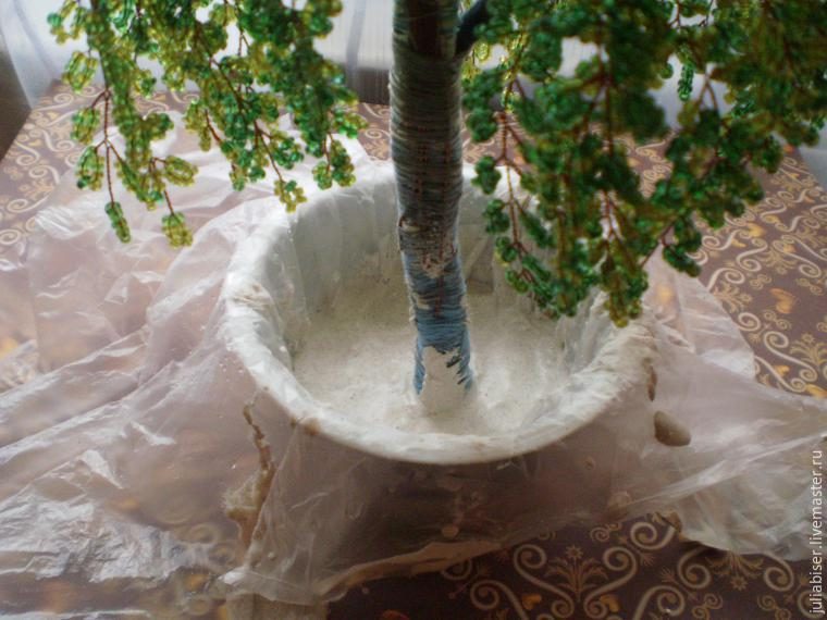 Теперь нам надо посадить нашу березку. Берем емкость, застилаем целлофановый пакет. Разводим алебастр и воду, только не слишком густо, сажаем дерево и заливаем эту смесь в емкость. Ждем, пока смесь застынет, станет довольно крепкой, извлекаем дерево, убирем пакет.