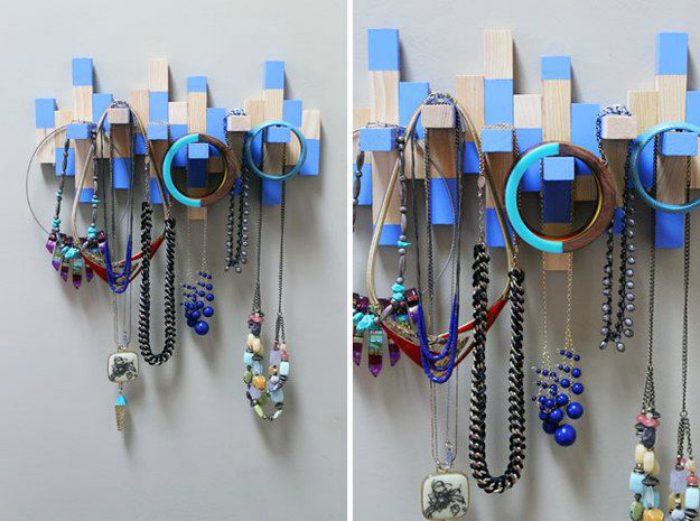 Простой и стильный органайзер для украшений, который можно сделать соединив вместе 5-6 деревянных брусочков от настольной игры «Дженга».