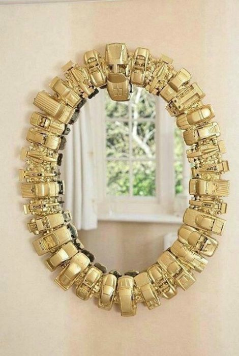 Оригинальную раму для зеркала можно смастерить из ненужных моделек машин, покрашенных блестящей краской.