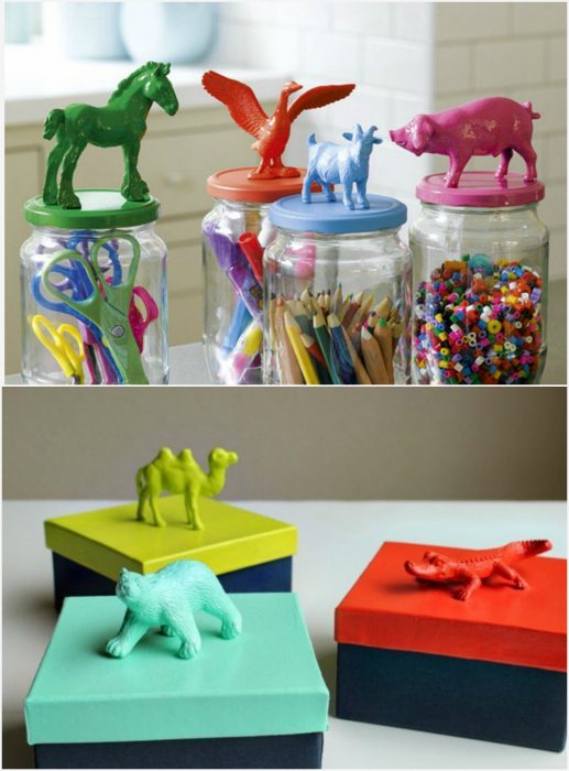Крышки банок и коробок можно украсить, приклеив к ним пластиковые фигурки зверей.