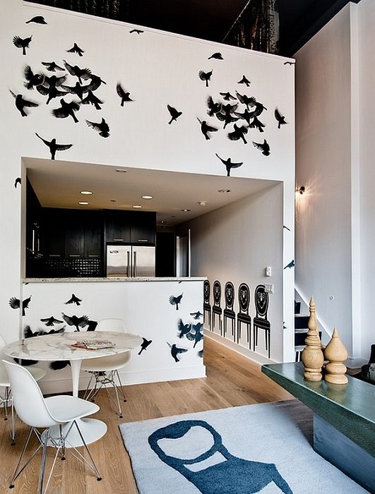 Кухня охвачена властью парящих птиц, которые нарисованы на стене.