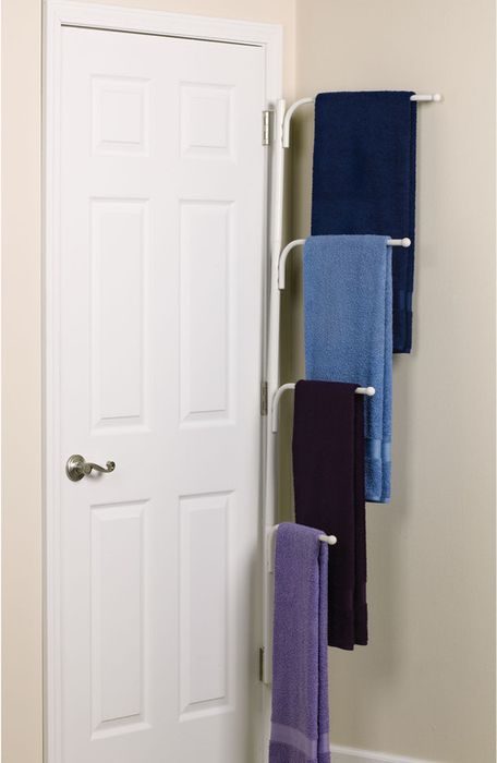 Иногда в ванной нужно разместить большое количество полотенец. Справиться с этим поможет скрытый многоуровневый держатель, который легко прячется за дверью. Для чистых полотенец не лишним будет установить навесной органайзер, а в нём разместить полотенца в скрученном виде. Для разнообразия можно поиграть с формами и дизайном полотенцесушителей.