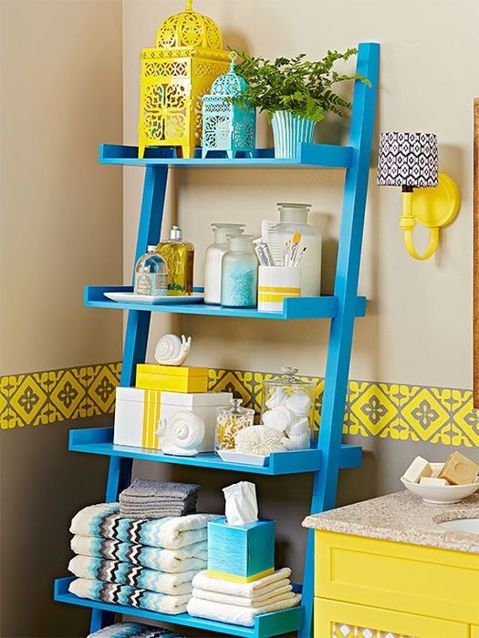 Самый верный способ разместить как можно больше предметов личной гигиены – организовать вертикальное хранение. Для этого пригодятся открытые полки небольшого формата, мобильные этажерки, компактные навесные шкафчики и угловые стеллажи. Даже самая обычная стремянка может отлично справиться с ролью системы хранения. А чтобы интерьер ванны не был скучным, желательно выбирать мебель ярких оттенков или собственноручно перекрасить её. Такие предметы интерьера будут выступать в роли цветовых пятен и создавать хорошую атмосферу.