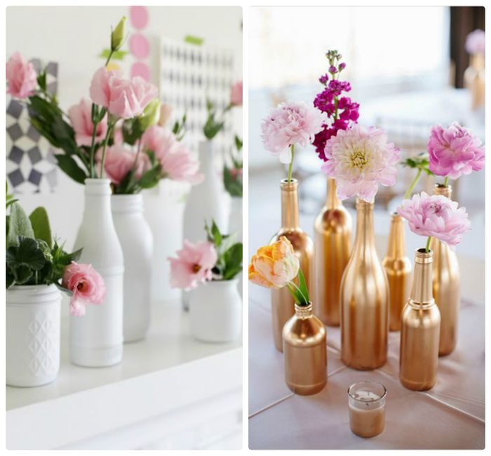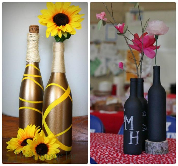 Для того, чтобы сделать подобную инсталляцию, понадобится также избавиться от этикеток, купить баллончик аэрозольной краски и выбрать подходящее место для готовой композиции. Бутылки сами по себе будут смотреться очень привлекательно (особенно, если они будут покрыты бронзовой или золотистой краской), но для усиления эффекта рекомендуется дополнять их декоративными растениями. Их можно выбирать в зависимости от сезона, или же делать контраст – ставить зимой в вазы розы или тюльпаны. Такой ход наверняка удивит гостей.