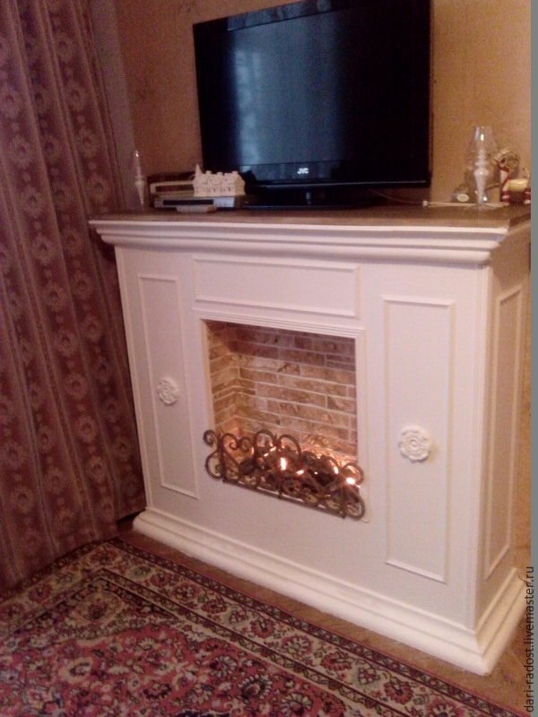 Соорудили коробочку-топку, прикрутили изнутри, параллельно отделав пластивой декоративной панелью с изображением кирпичей (закрепляла мебельным степплером), деревянной раскладкой отделываем портал (крепила на строительный клеевой пистолет).