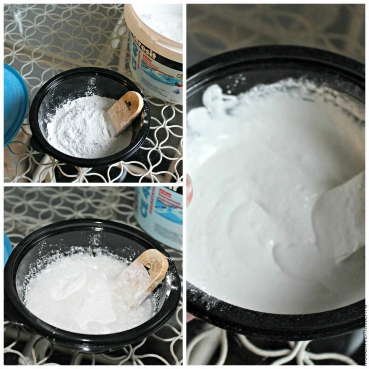 После того как высохнет клей, начинаем подготавливать затирку. Насыпаем нужное колличество сухой смеси в пластиковую посуду. Добовляем воды и перемешиваем. Затирка должна напоминать 25% сметану :)