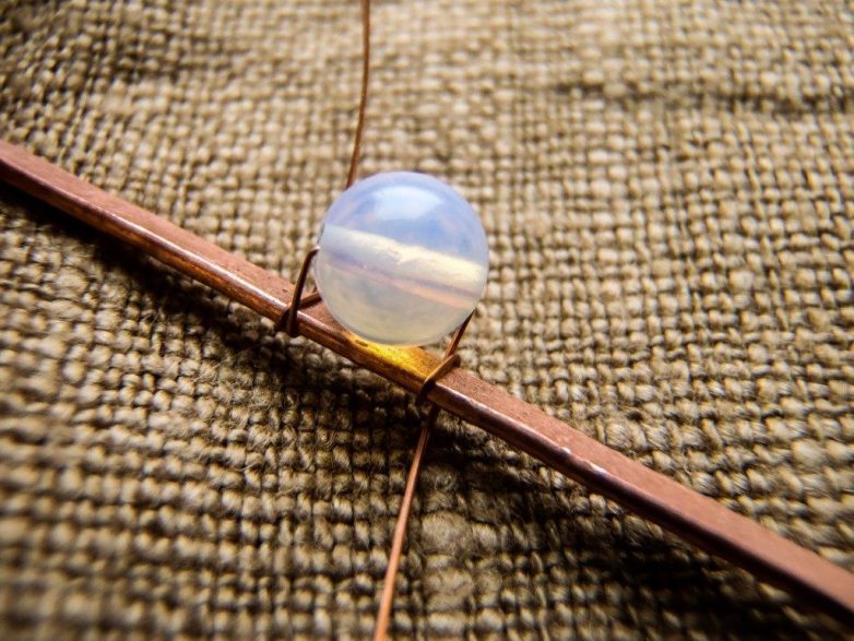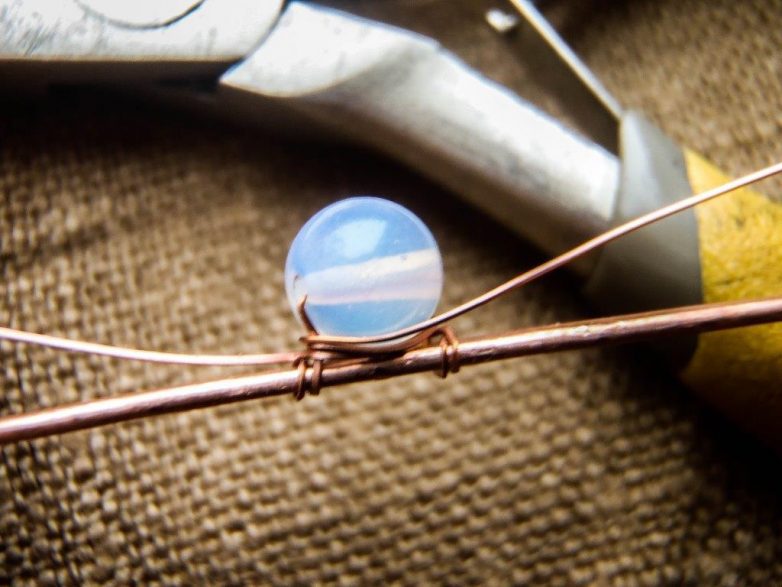Итак, нанизываем бусину на тонкую проволоку и располагаем примерно посередине. Затем прикладываем проволоку с бусиной к середине заготовки и, хорошо натягивая проволоку, пару раз оборачиваем оба ее конца вокруг заготовки. Ключевой момент здесь — проследить, чтобы бусину не «перекосило», то есть чтобы отверстие в бусине располагалось параллельно плоскости заготовки.