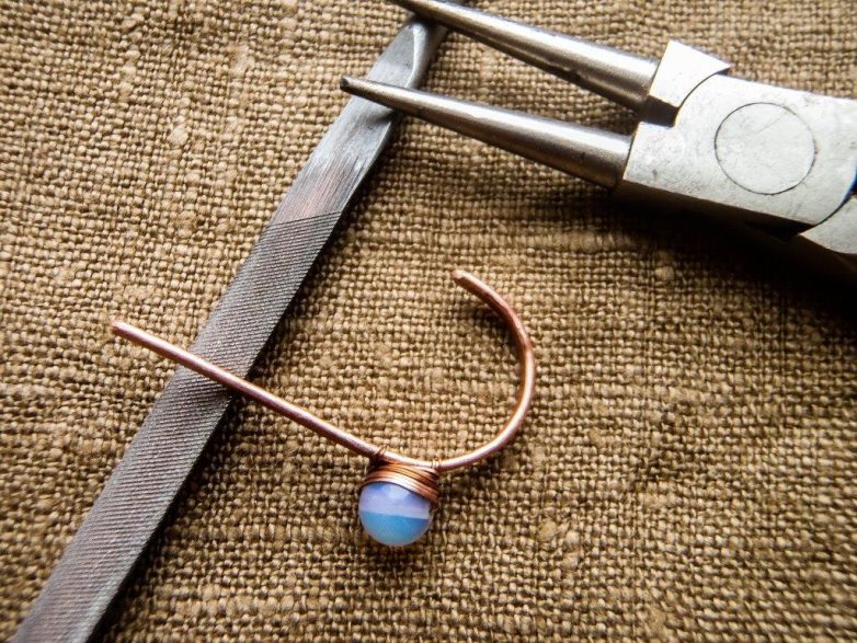 И сейчас нужно зашлифовать концы основы при помощи надфиля, делая кончики округлыми и гладкими. Причем может быть так, что бусина в итоге расположилась не совсем по центру основы, тогда нужно будет чуть-чуть подрезать основу кусачками.