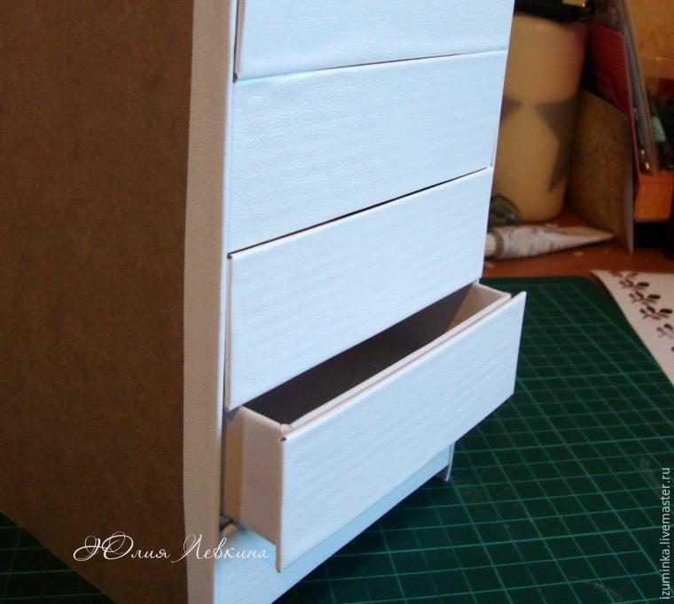 Теперь из того же картона вырезаем фасад комодика и обклеиваем нашей пленкой. Размеры брала на глаз, чтобы при выдвигании ящичков они не цеплялись друг за дружку, но и чтобы щелей не было.