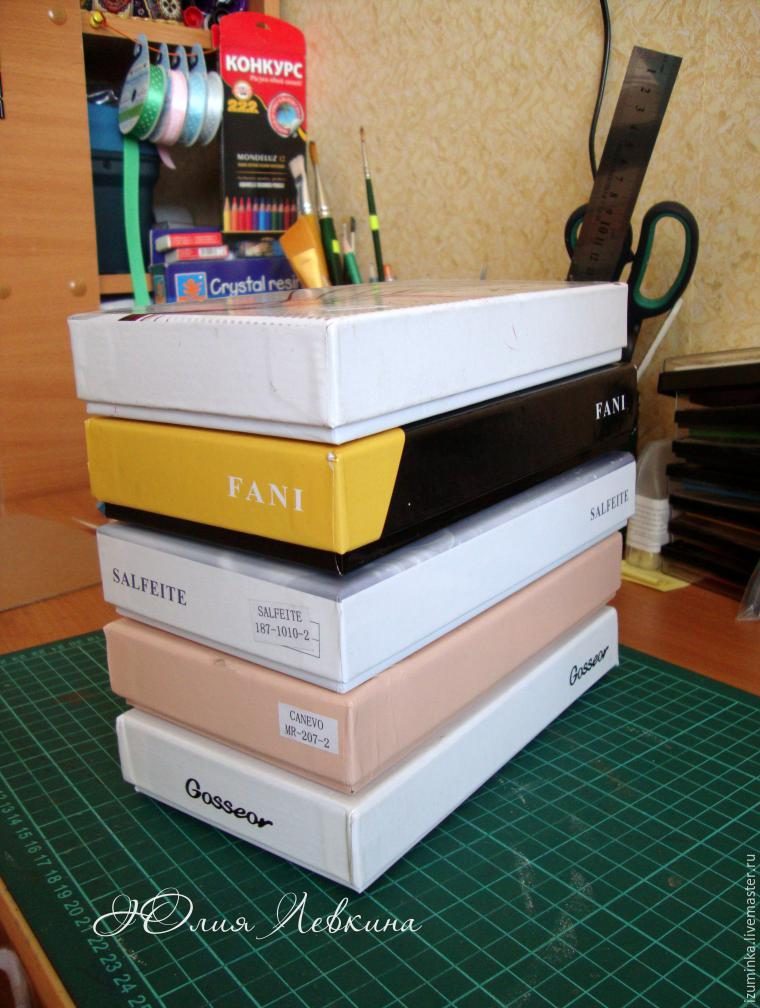 У меня дома завелись вот такие коробочки. Выбираем одинакового размера. Для комода с 5 выдвижными ящиками я взяла 6 коробочек. Эти коробочки от портмоне принесла мне мама, выпросив у продавца в магазине. Продавцы их выбрасывают, а нам они как раз нужны.
