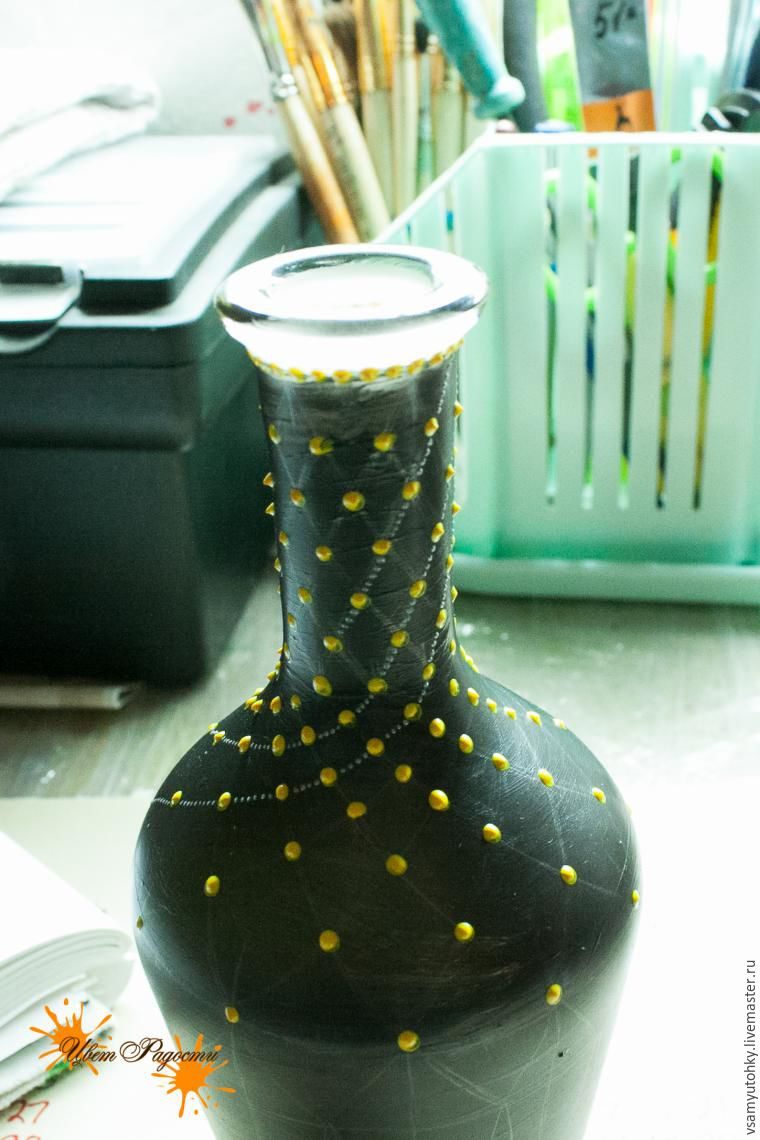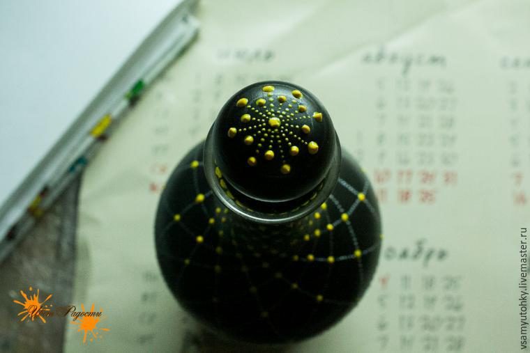 Начинаю роспись контурами с горлышка. Сначала ставлю крупные желтые точки в местах пересечения сетки, затем заполняю промежутки между ними маленькими точками серебристым контуром.