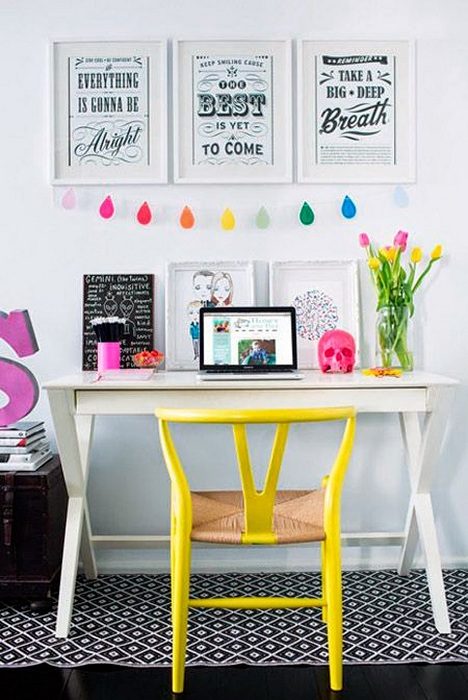 Рабочее место дома дополнено яркими элементами декора.