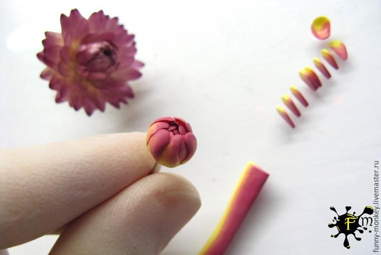 Выбираем цвета полимерной глины, из которых мы будем лепить цветок. Я подбирала похожие цвета на настоящий цветок бессмертника, для этого смешала красный фиолетовый и белый для получения необходимого оттенка в одном кусочке, а во втором смешан белый и желтый цвет. Вы можете взять любое другое сочетание.