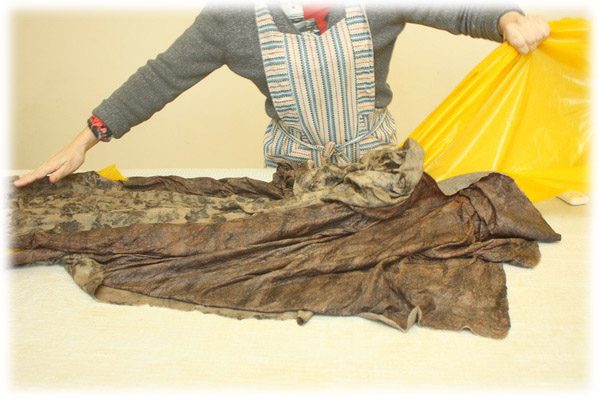 Раскладка шерсти — однослойная (комбинированная); по низу изделия (15-20см) — горизонтальная, для того, чтобы обеспечить спрямленный к низу силуэт. Далее — вертикальная с радиальной раскладкой в области груди. Вдоль открытых краев (горловина, пройма) — дополнительный укрепляющий слой шириной в одну пасму, параллельно срезу.