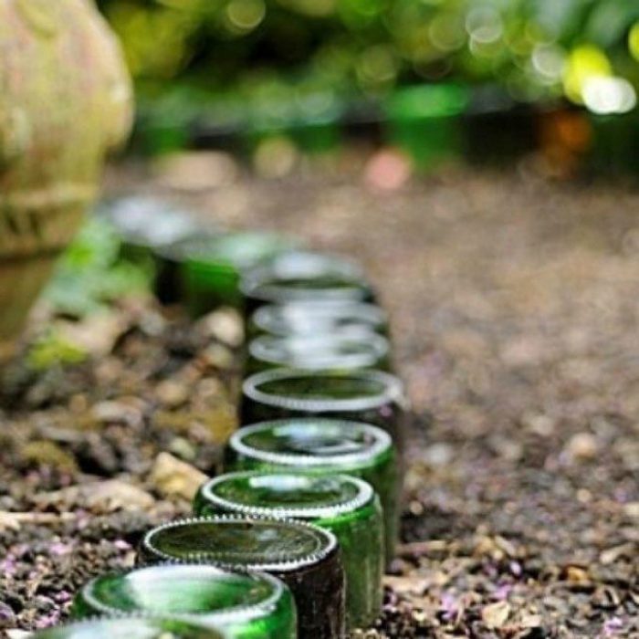 Используйте пустые стеклянные бутылки, чтобы сделать красивую окантовку клумбы или для зонирования огорода.