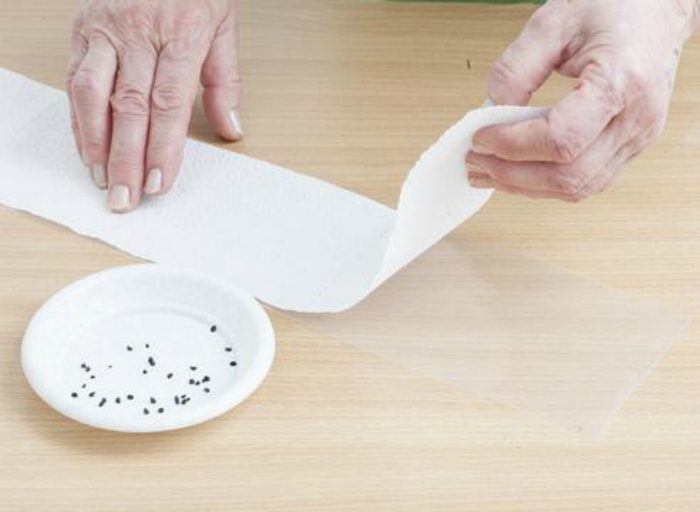 Возьмите дешевую двухслойную туалетную бумагу и слегка отделите один слой от другого, разложите семена в ряд и слегка проклейте слои. Бумага хорошо склеивается и хорошо размокает весной в земле после полива.