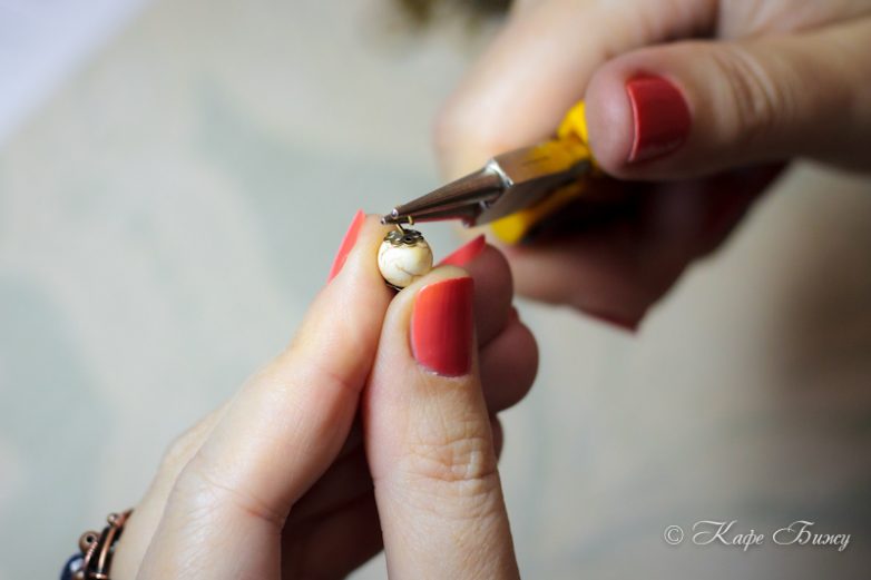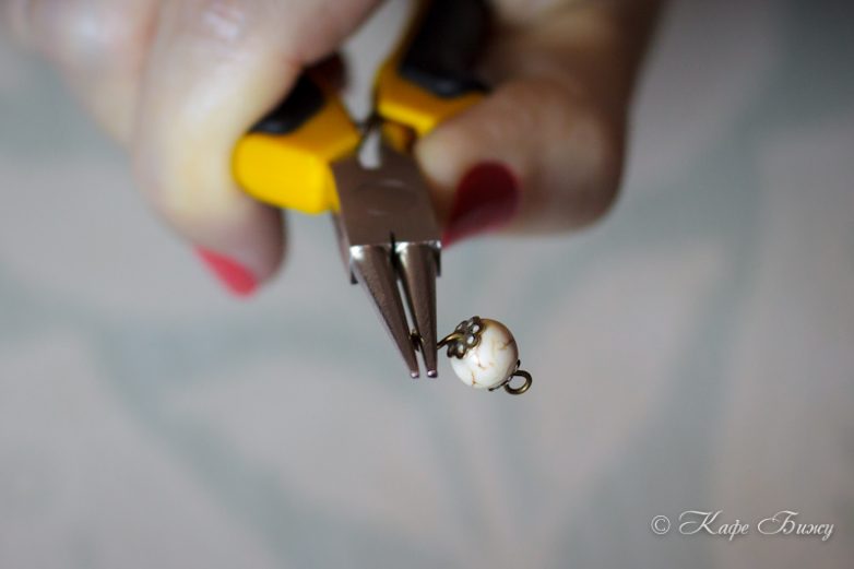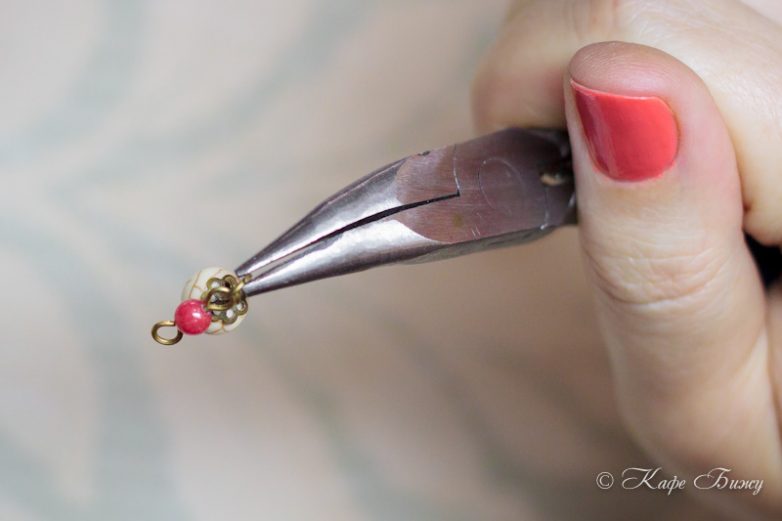 Подготовим остальные элементы к сборке. Набираем на пин с петлей бусину, обрамляем ее двумя шапочками.