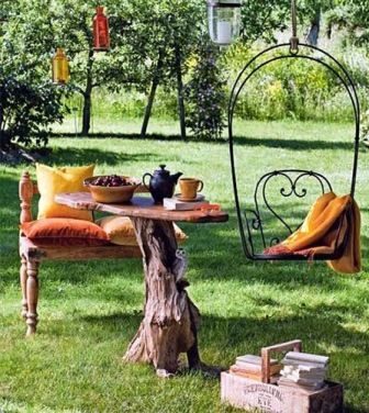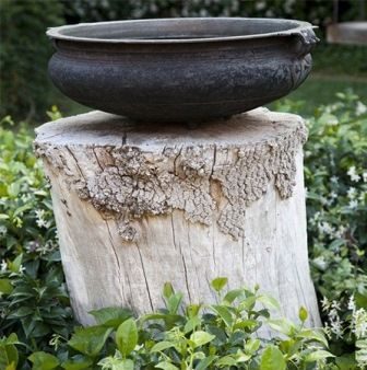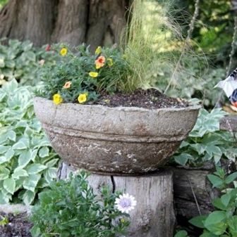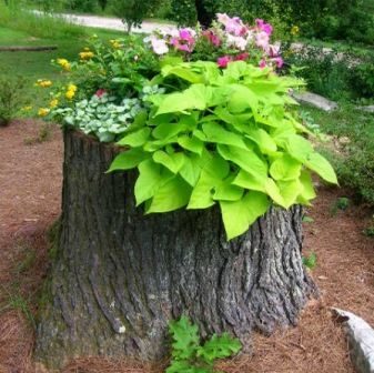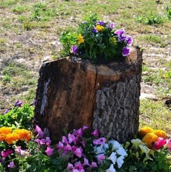 Низкий пень станет идеальным «горшком» для красочной аранжировки растений, если выдолбить у него середину и засыпать землей.