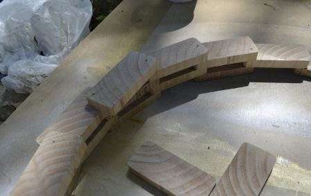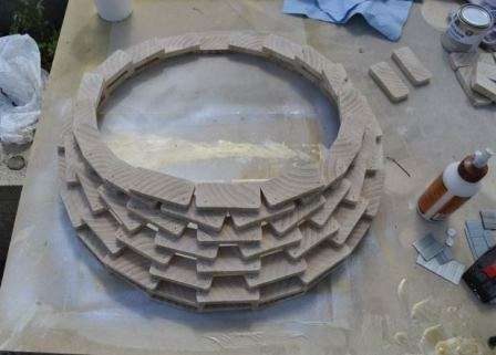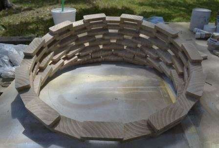 Для сборки кашпо из дерева рисуем круг на рабочей поверхности, диаметром 48 см. Размещаем 11 заготовок по кругу, затем сверху на стыки еще 11, сажаем на клей и закрепляем 20 мм гвоздями.
