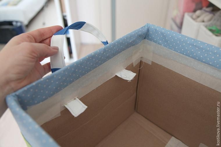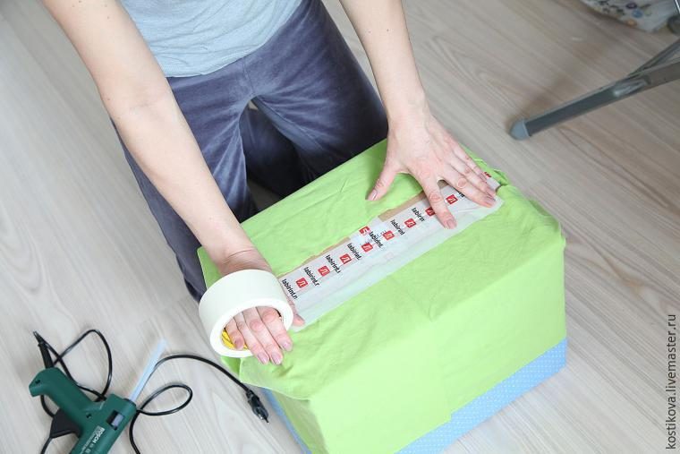 Прикладываем ткань сложенным краем к коробке и фиксируем ткань скотчем. Просто чтобы не убегала.