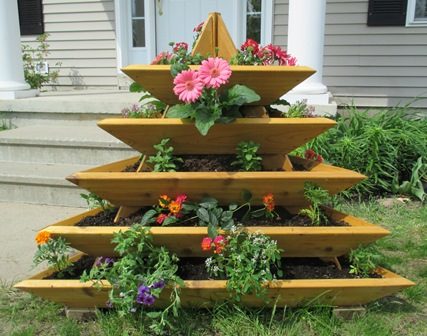 Вертикальная клумба в виде пирамиды позволяет садоводам, особенно имеющим небольшие участки значительно расширить площадь для посадки, цветов, трав, овощей.