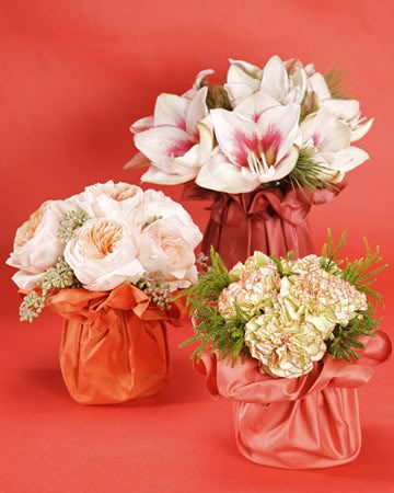 Антипод предыдущим примерам – нежные романтичные вазочки декорированные тканью.