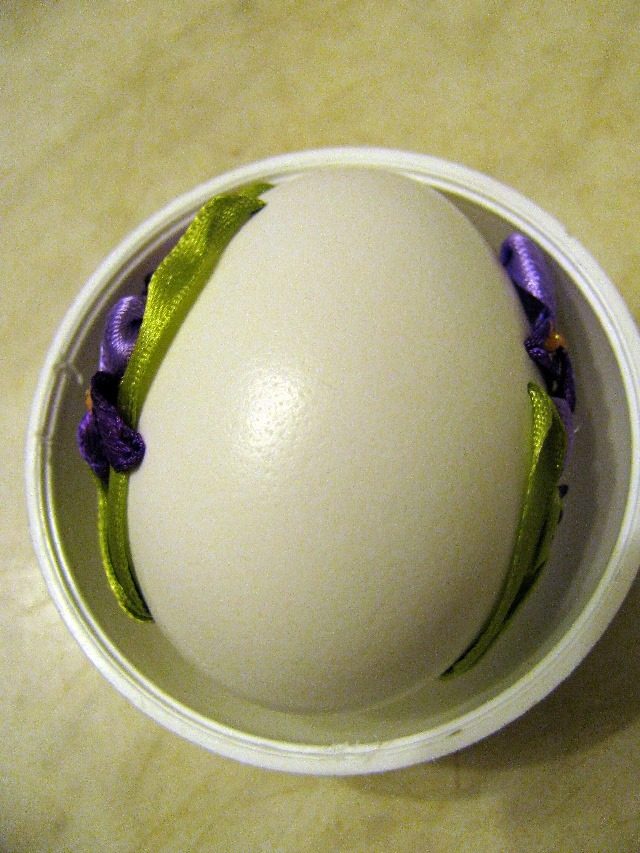 Вышивка каждой стороны ведется автономно. Иначе сломать работу можно просто запутавшись в переплетениях лент внутри яйца.
