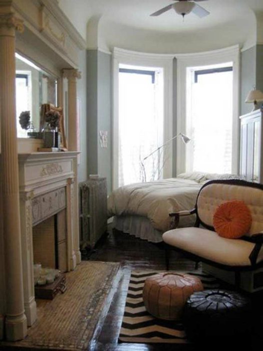 Нестандартная расстановка мебели позволит разместить все желаемое даже в самой крохотной спальне.