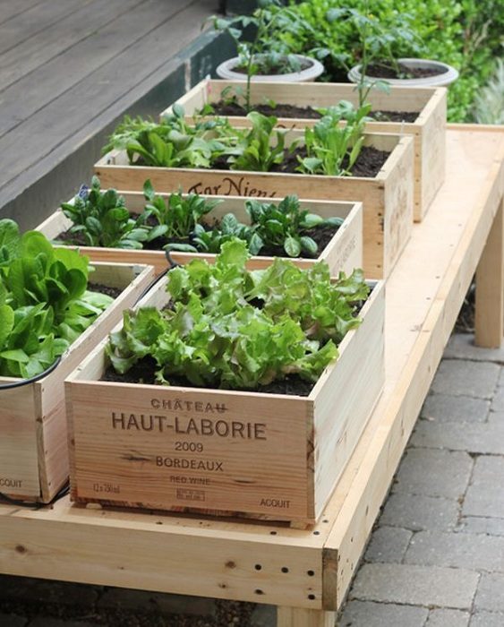 Прекрасный вариант использовать коробки для вина в целях создания места для посадки овощей и фруктов.