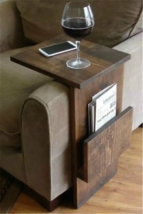 Компактный и удобный приставной столик с отделением для хранеия корреспонденции, сделанный из темного дерева.
