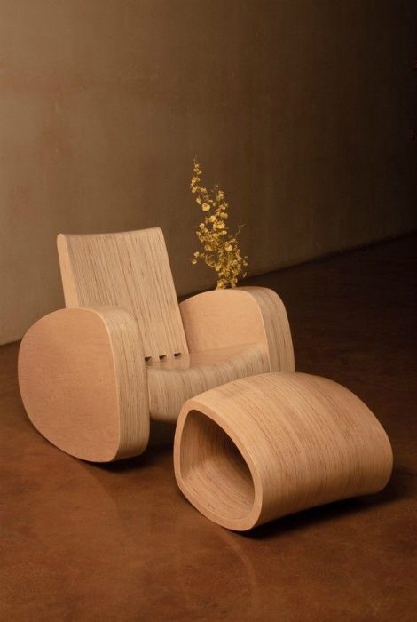 Кресло-качалка и оттоманка, сделанные из натурального дерева, поражающие своей простотой и оригинальностью.