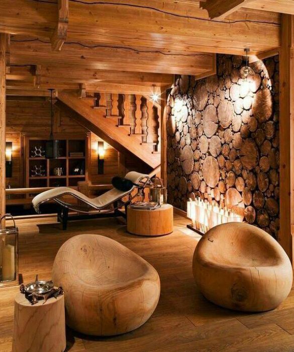 Стильный декор стены поленьями. Таким образом можно оформить одну из стен городской квартиры или все стены дома.