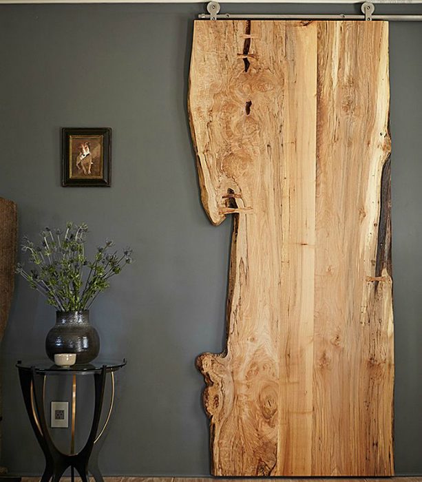 Фантастическая дверь на роликовом механизме, которая выглядит, как необработанный кусок древесины.