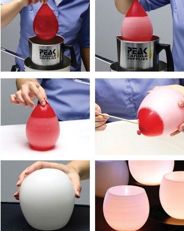 Делается аналогично, только шарик опускается не в шоколад, а, предварительно наполненный холодной водой, в горячий воск.