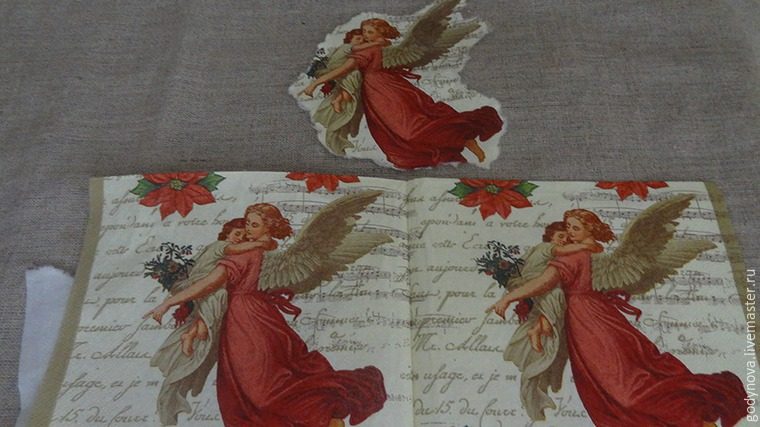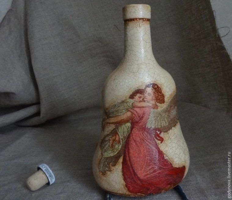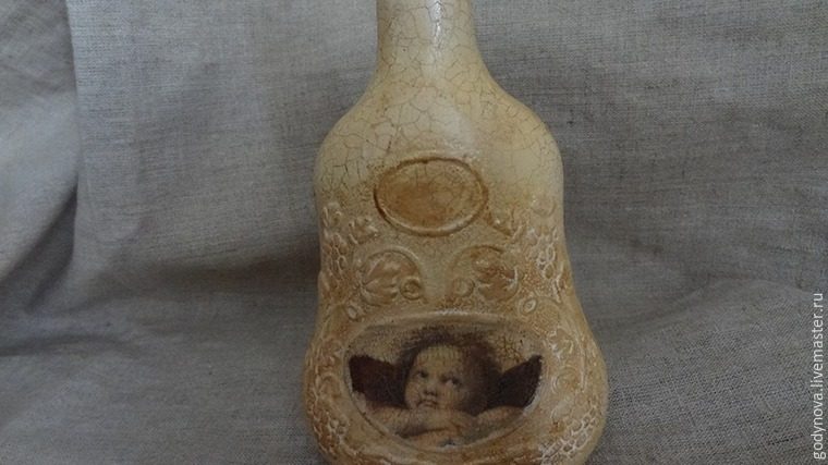 И снова сушим. А теперь начинается самое интересное — ищем салфетку. Так как бутылочка делается для святой водички, то ангелочки будут в самый раз.