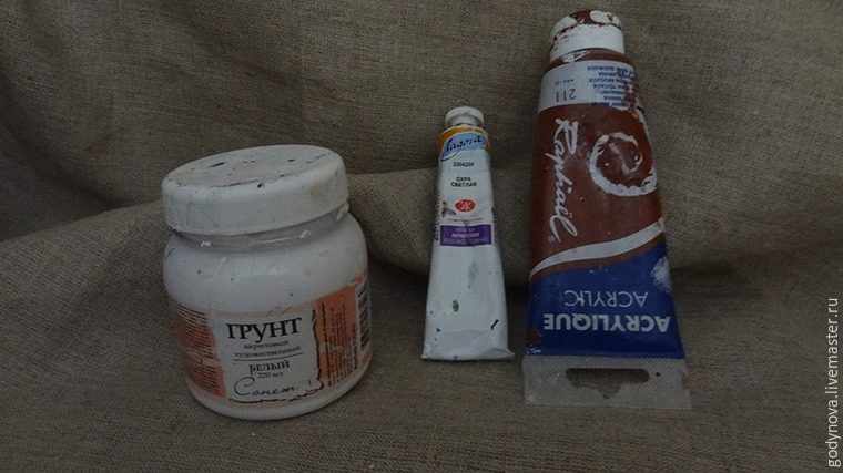2) краски акриловые, краска масляная-умбра для затирки трещин;