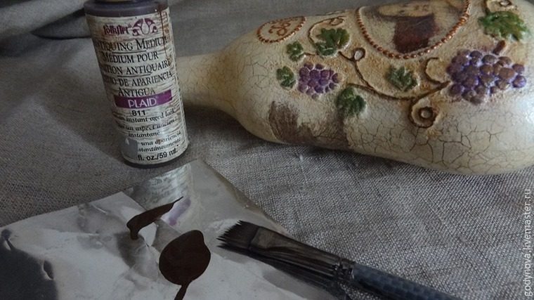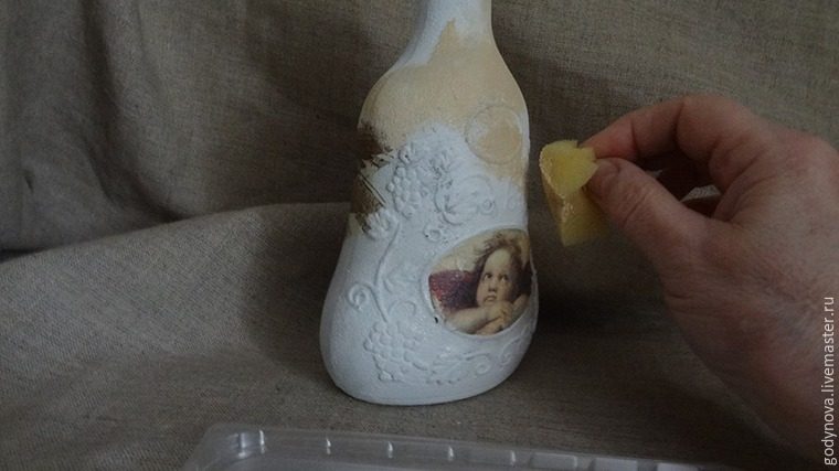 В белую краску понемногу добавляю охру и капельку сиены. Красим бутылочку губкой. Не забываем про донышко. Кисточкой подкрашиваем возле рисунка.