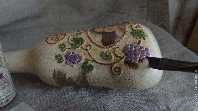 Вот теперь получилась замечательная белая бутылочка. Отлично стал виден рисунок: виноград и виноградные листья.