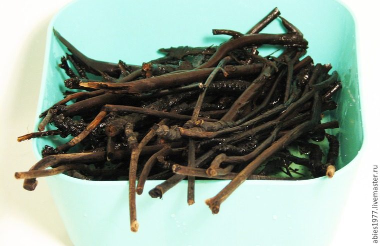 На фото вываренные веточки рябины и туи. В процессе варки из древесины выходит воздух — веточки должны утонуть. Сухие ветки варятся 3-4 часа, свежие можно так долго не варить. У меня были совсем сухие веточки, пролежавшие несколько лет в помещении. Сколько нужно варить свежесрезанные ветки — дело рук эксперимента. Кора легко отделяется у хорошо проваренных веточек, можно немного помочь рукам тупой стороной ножа.