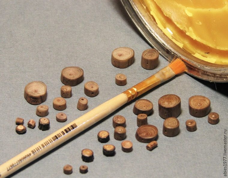Один из вариантов финишного покрытия бусин — воск. Можно покрывать льняным маслом, различными лаками. Хорошо промазываем кисточкой со всех сторон без излишков, сушим пару-тройку часов, полируем бархоткой.