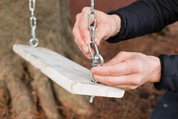 Теперь в просверленные отверстия вставляем крюки с ушком и закрепляем их гайками с шайбами, к «ушкам» присоединяем карабин, чтобы вставить в него же кольцо цепи. Определяем длину цепи от ветви дерева до земли с помощью рулетки: имейте в виду, что оптимальное расстояние от сидения качелей до земли — около 50 сантиметров.