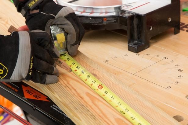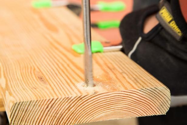 Отмерьте рулеткой 50-55 сантиметров и обрезаем доску. Теперь нужно высверлить отверстия для крюков. Отмерьте 2,5 см от края и найдите центр доски по ширине — поставьте карандашом отметку и просверлите отверстие. Повторите со второй стороны.