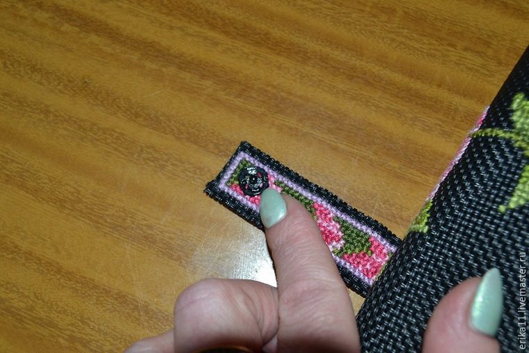 К части с вышивкой пришиваем застежку, обратите внимание — застежка вышита с обеих сторон.