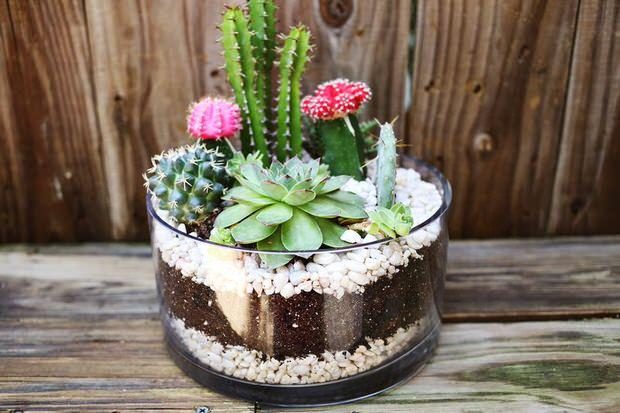 Отличным горшком для суккулентов и кактусов станет любая стеклянная емкость. Чтобы такое решение выглядело еще интересней, грунт в горшке можно чередовать со светлой галькой.