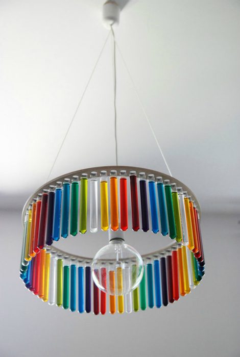 Красочный абажур из множества пробирок, заполненных цветными жидкостями.