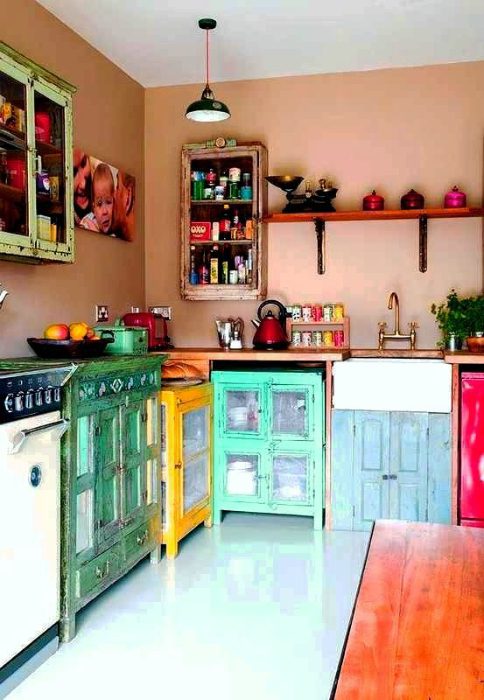 Красочная мебель в интерьере кухни.