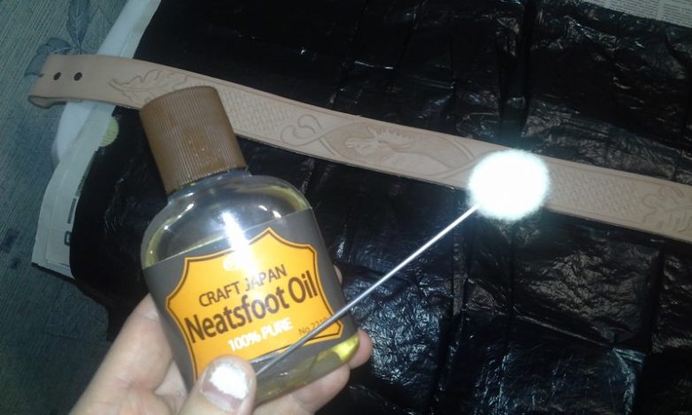 Первым делом наносим копытное масло (костное масло). Оно смягчит кожу, растишка (кожа растительного дубления) очень жесткая.