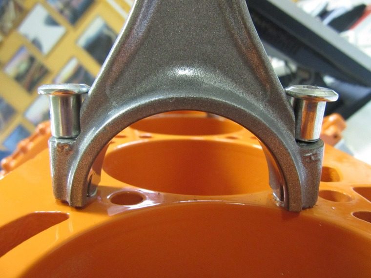 Далее устанавливаем поршни на наши шпильки. Гайки, как вы видите, здесь не простые. Обычные гайки с гранями не закрутились бы у нас, сами грани мешали бы закручивать гайку. Для этого есть специальные гайки без граней: