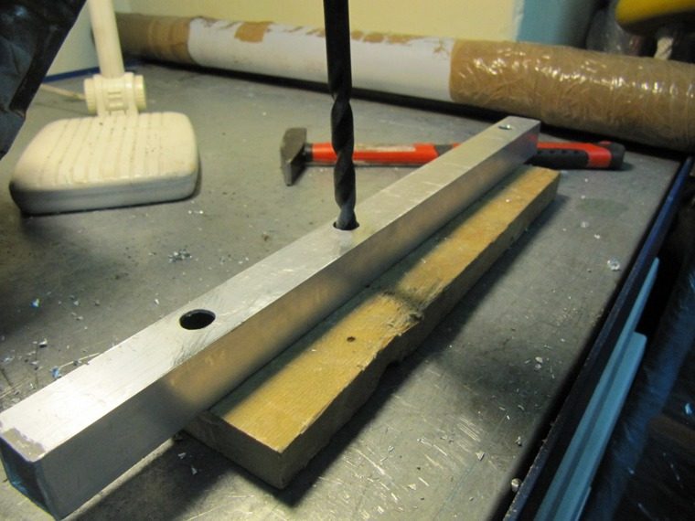 Затем подготавливаем профиль, к которому будут прикручены колеса нашего столика. Берем аллюминиевый профиль 25 на 25 мм, просверливаем в нем отверстия в местах будущего крепления к блоку: