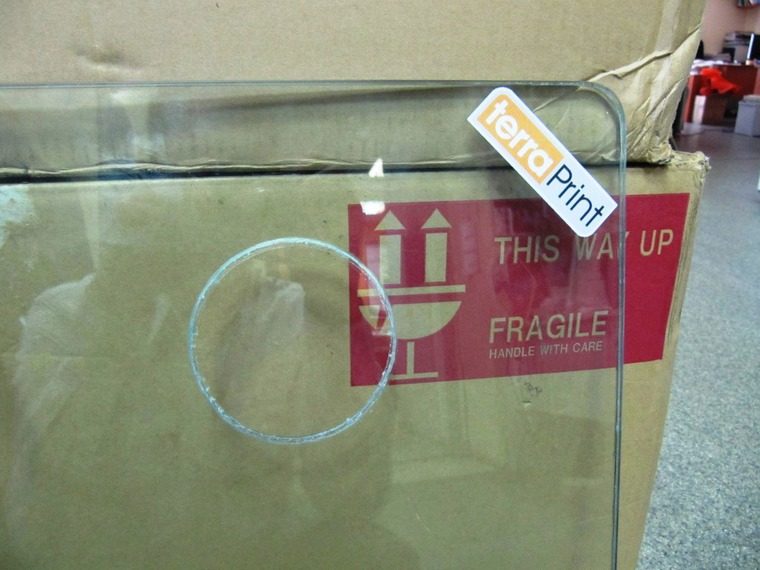 Изготовили стекло, которое состоит из двух частей — одна часть размером 780 мм на 500 мм, а вторая — такое же, но с вырезами под поршни. Триплексом соединяем их, шлифуем по краям, делаем УФ печать нашего логотипа по краям стекла и вот что получаем: